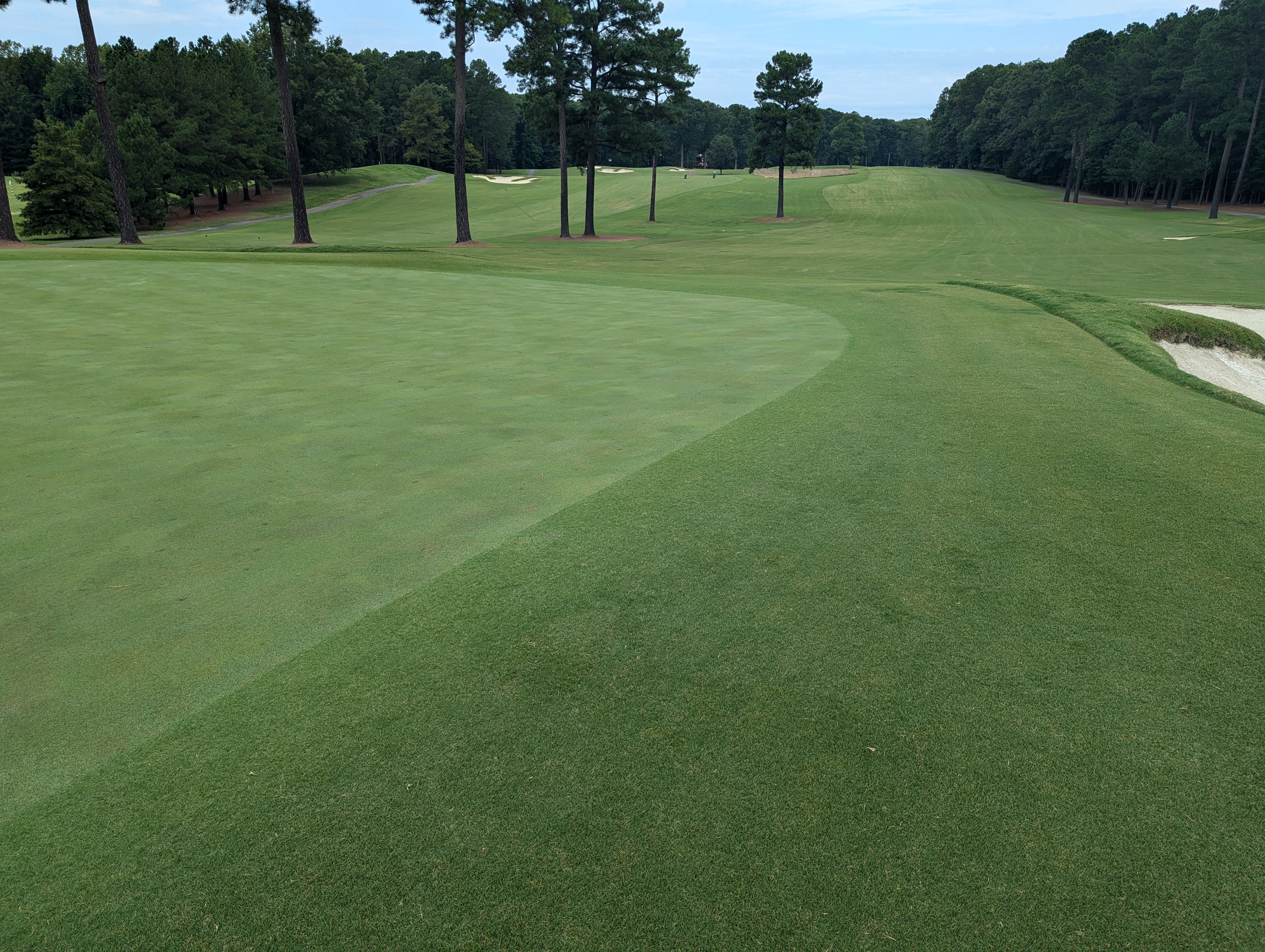 The sand dried up quickly in the heat and was brushed right in. The fairways were blown off again and then the mowers went through to start cleaning things up at their normal height, just under half an inch.